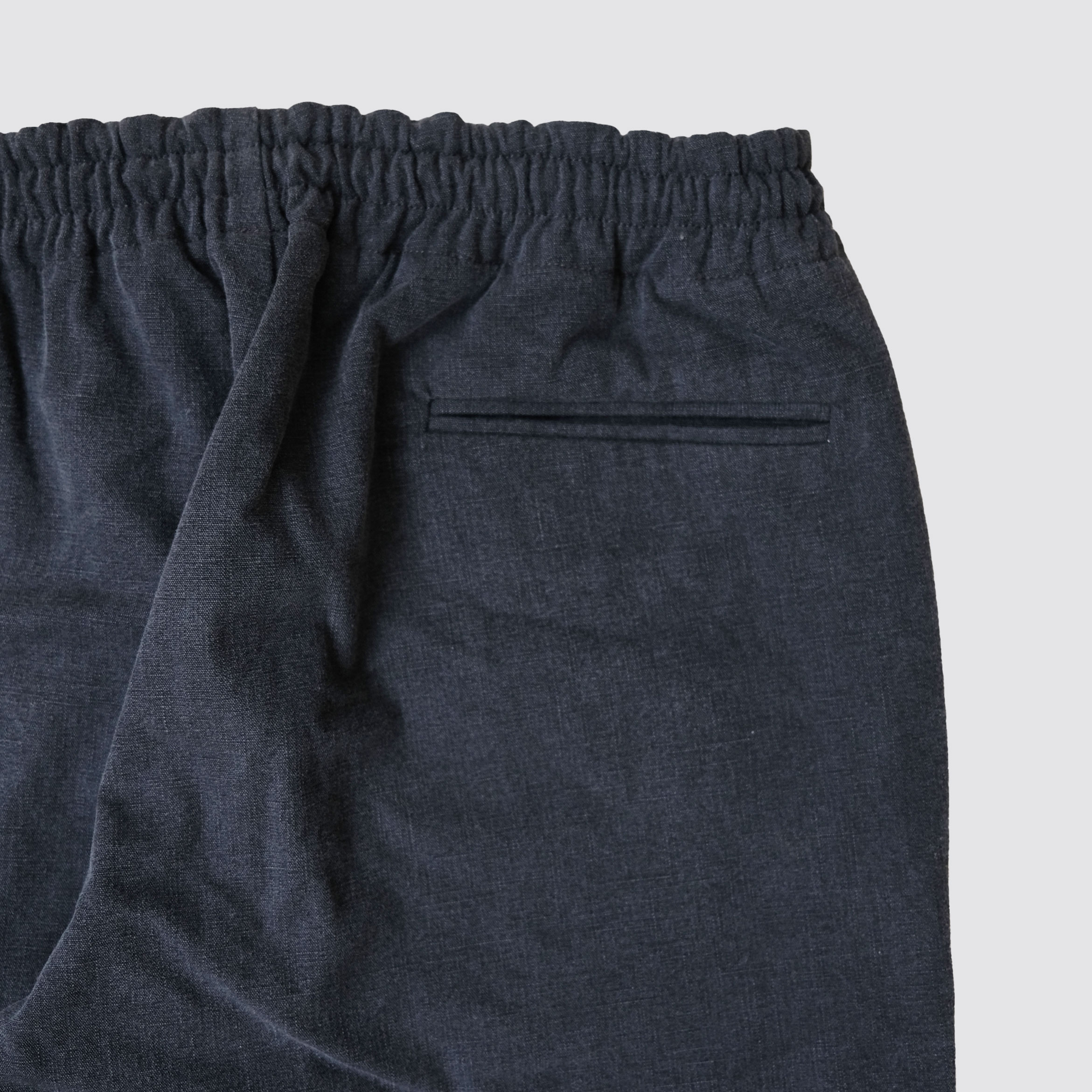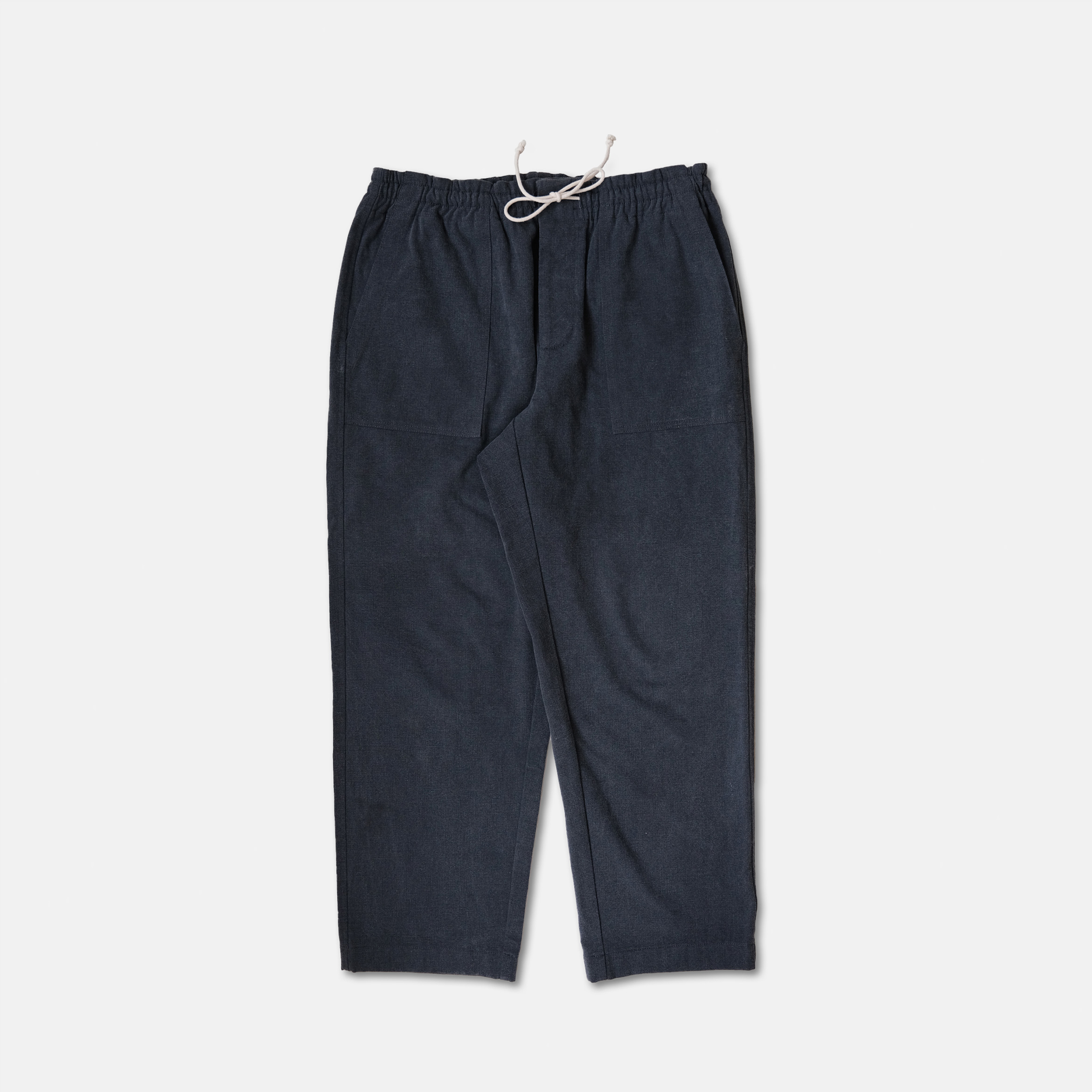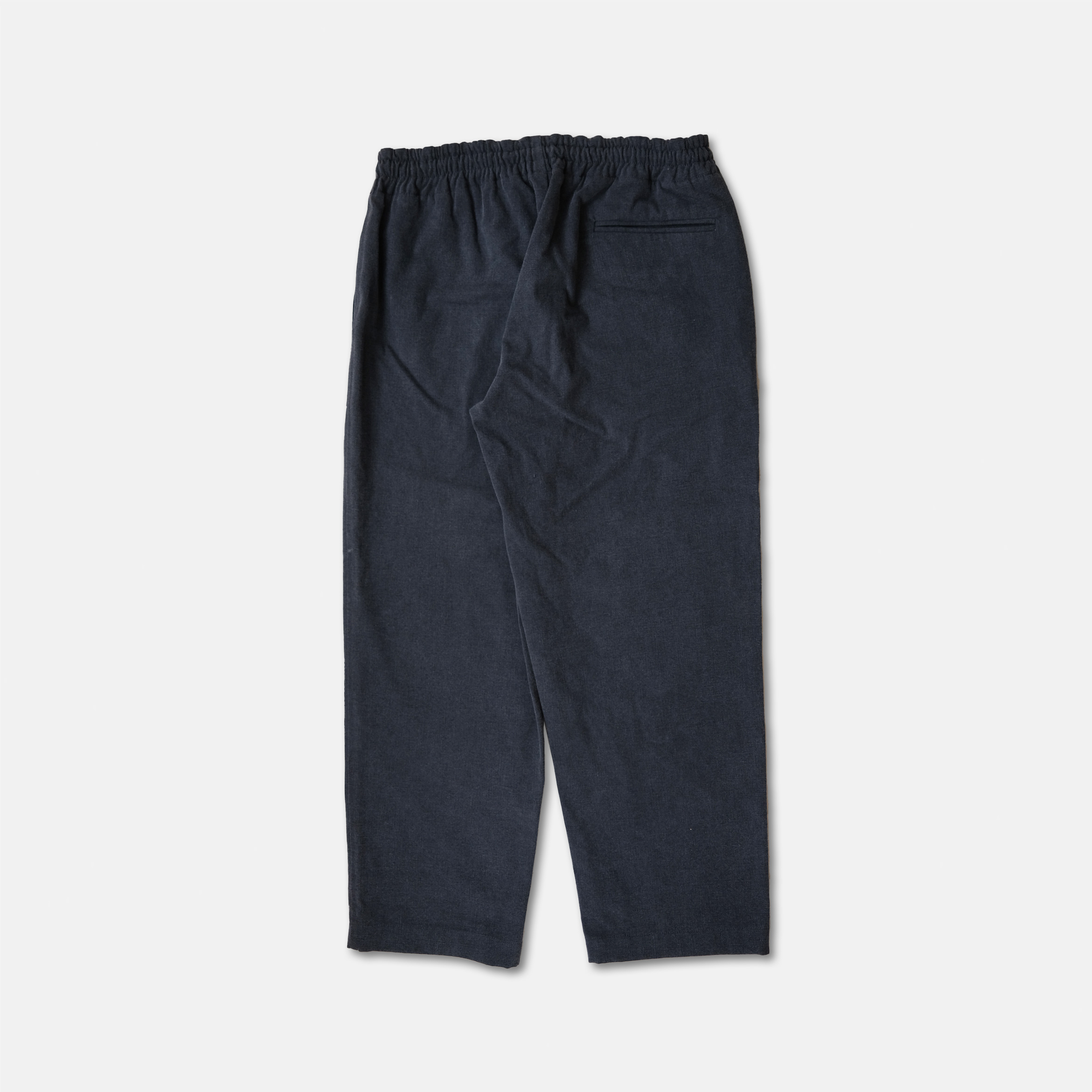 The trousers are a relaxed-fit piece cut from grey organic-canvas—dense, dry, and built to soften with wear. Two patch pockets rest quietly at the front, while a single welt pocket is set into the back right. An elastic waistband is threaded with a natural cotton draw-cord, its pale tone a subtle contrast against the muted cloth. The fabric is offered in this sturdy canvas first, yet can be swapped for a lighter alternative without disturbing the shape. Initially available in sizes M and L, they function as an everyday uniform—calm, uncluttered, ready for the rhythm of daily life