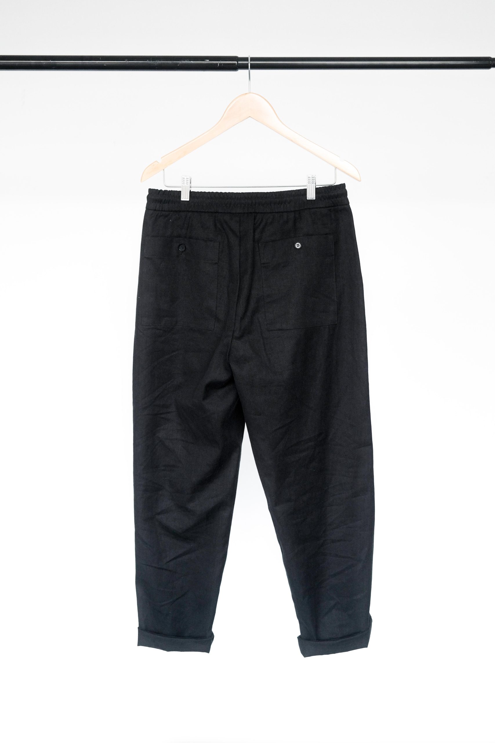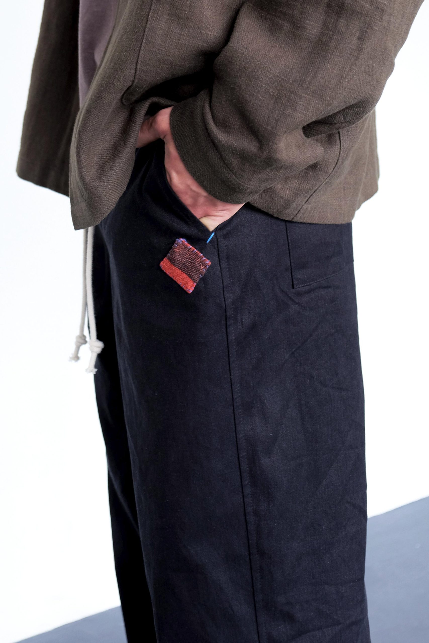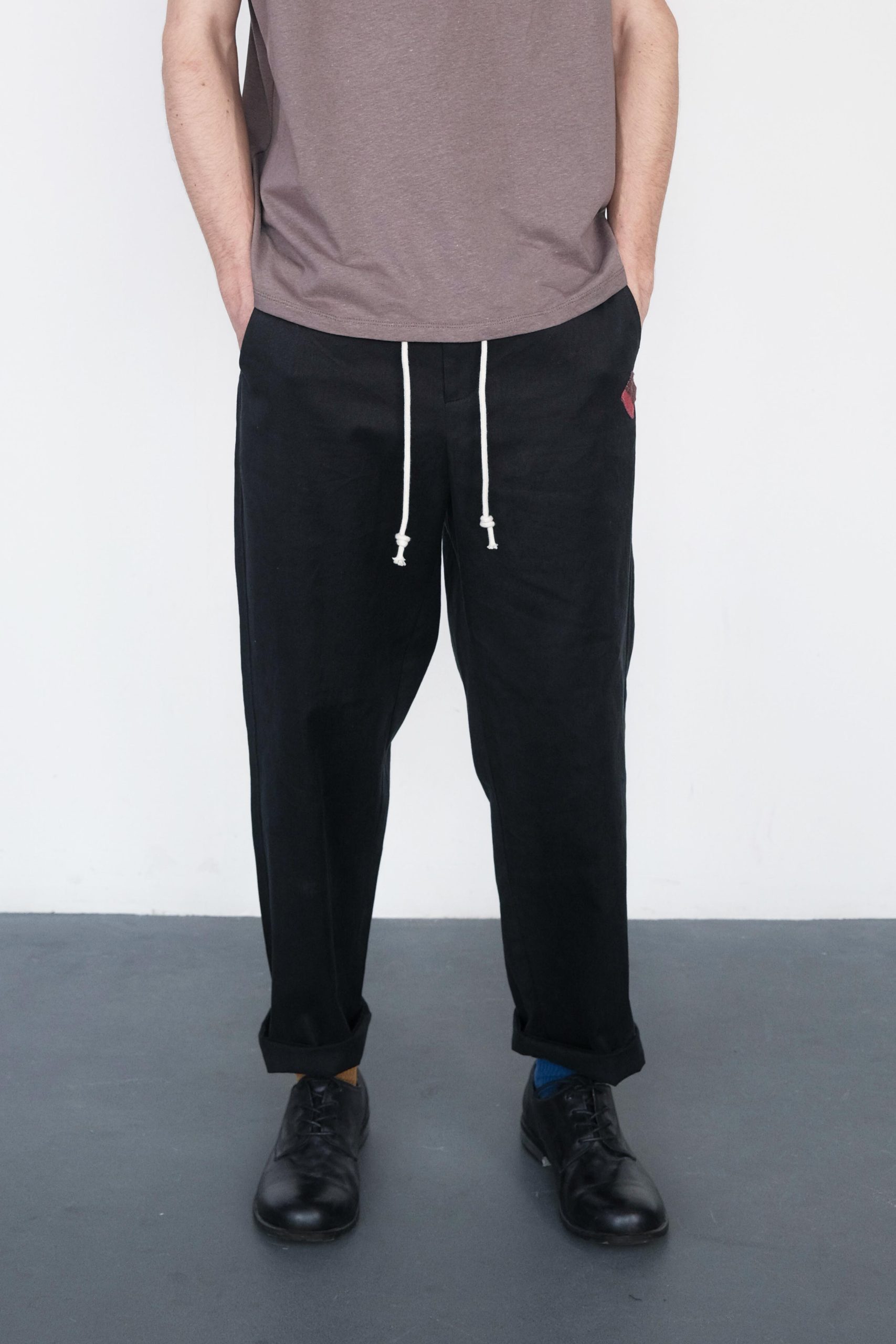 — Wide trousers in organic twill. Elastic waist, relaxed fit. Hidden coin pocket. Dense fabric softens with wear. Size M fits 46–48, L fits 50–52.