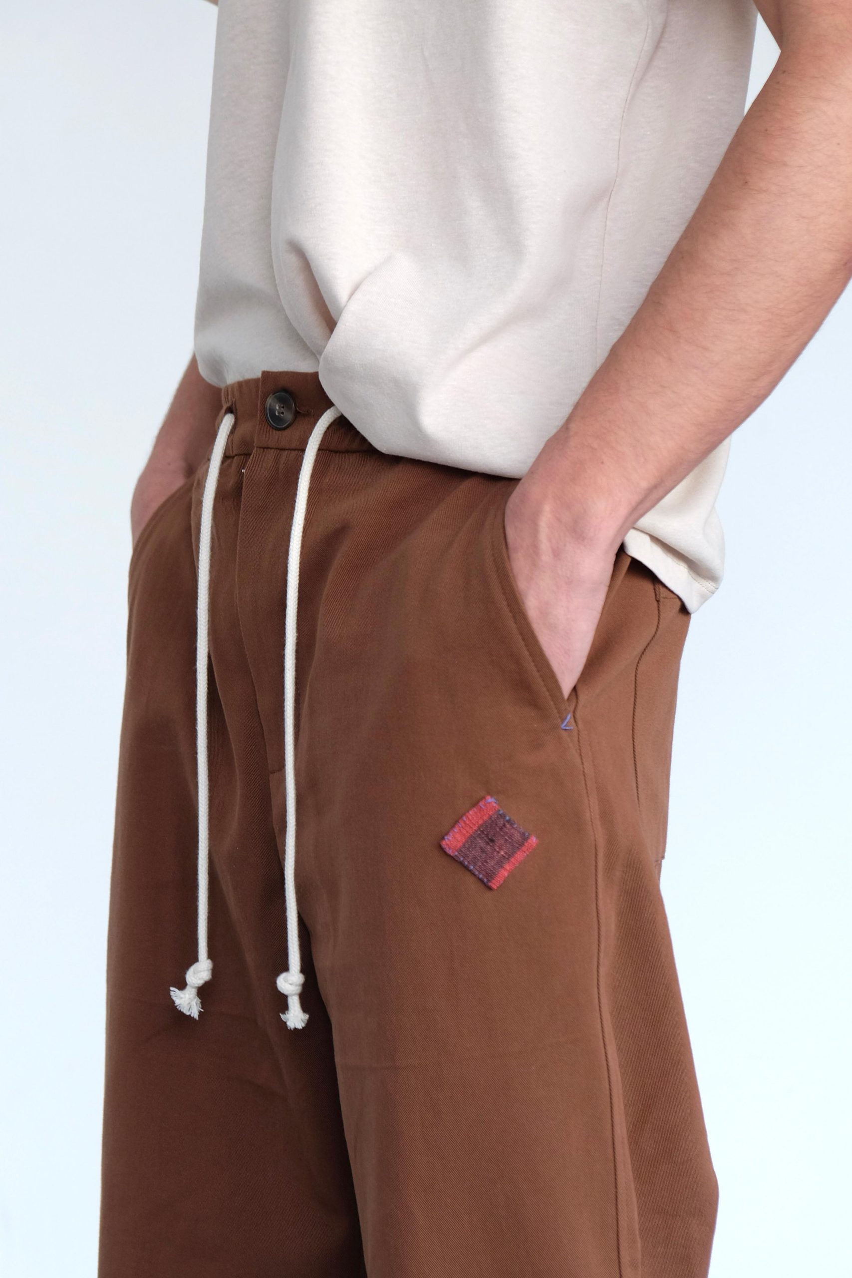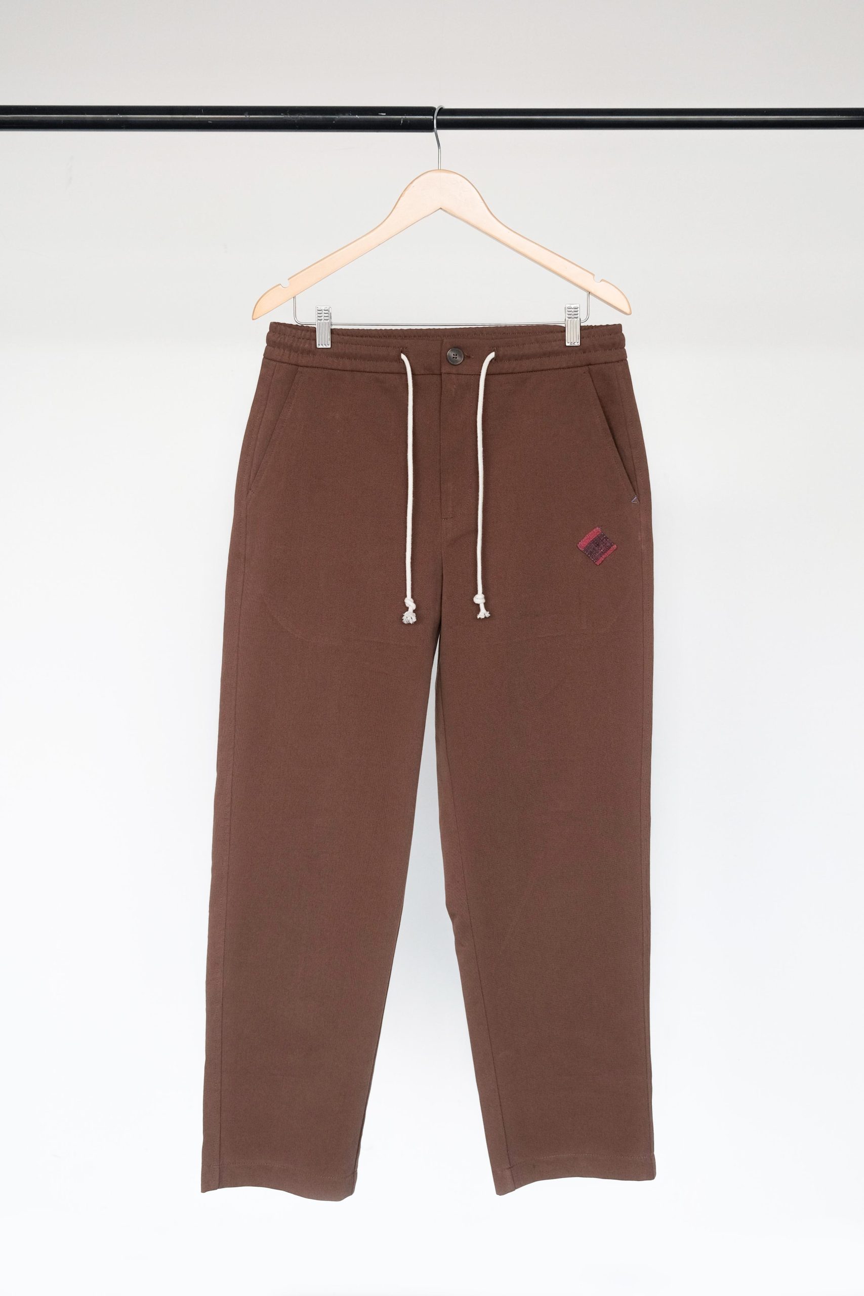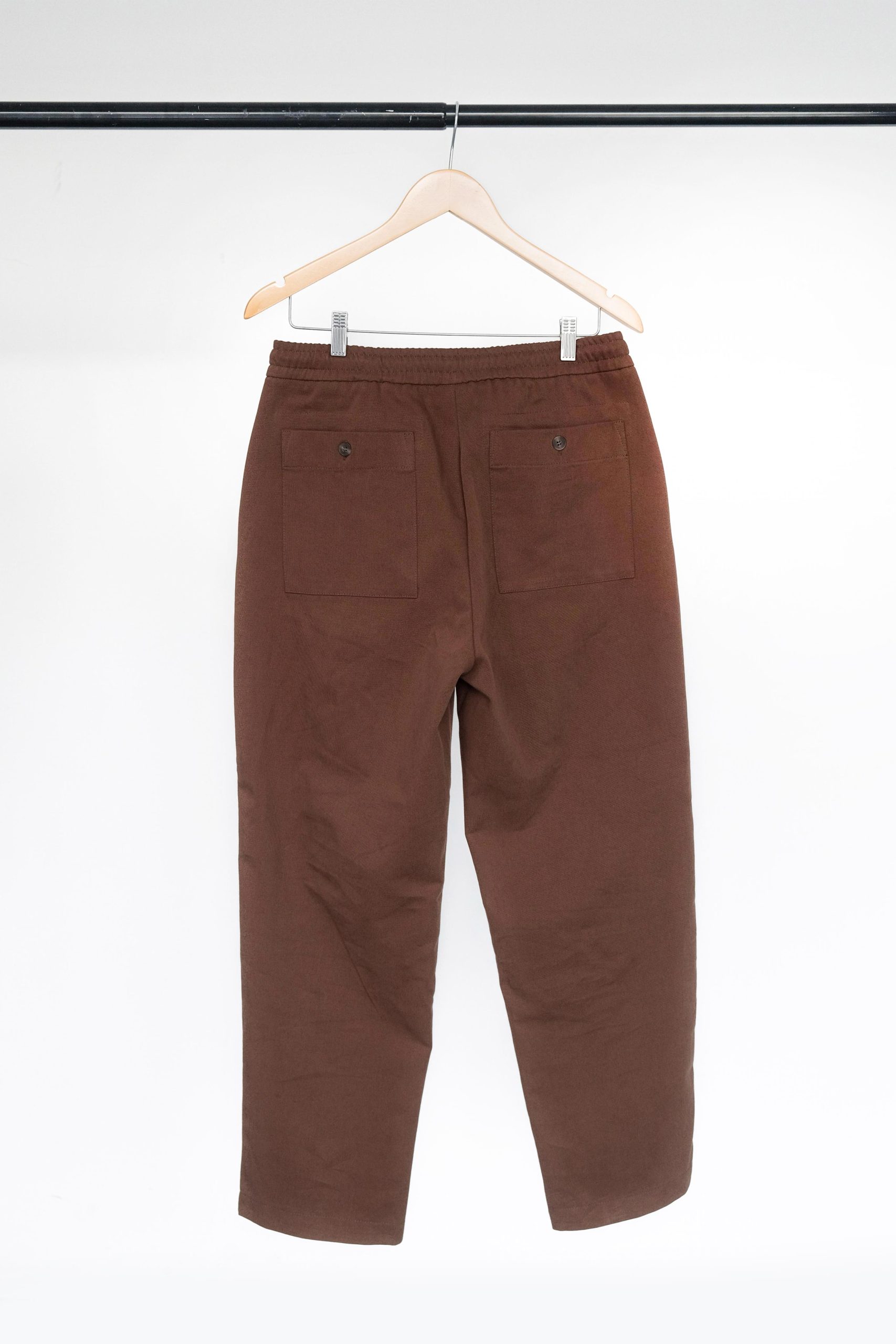 — Wide trousers in organic sanded twill. Elastic waist, relaxed fit. Hidden coin pocket. Dense 8oz fabric softens with wear. Size M fits 46–48, L fits 50–52.